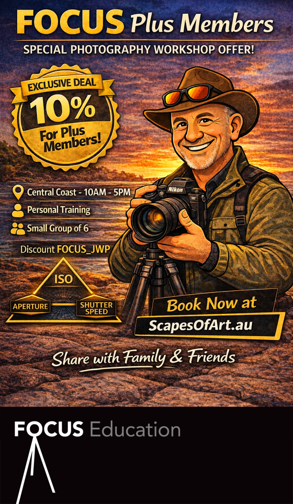 Focus member, Jeff Walsh (L.A.P.S.), runs hands-on beginner photography workshops on the Central Coast through the Scapes of Art Gallery, and he is offering Focus Plus members an exclusive 10% discount.